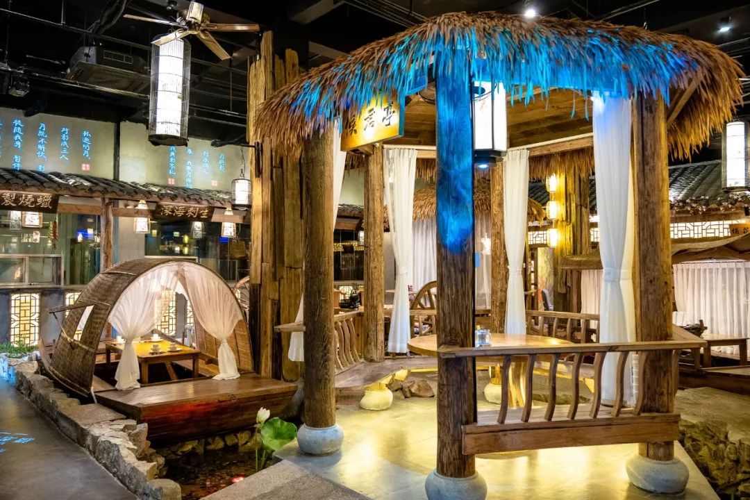 设计风格:园林餐厅。诺大的江南水乡园林造景,中国风亭台楼阁木质园林装修,还有户外雅座和儿童游乐园。
