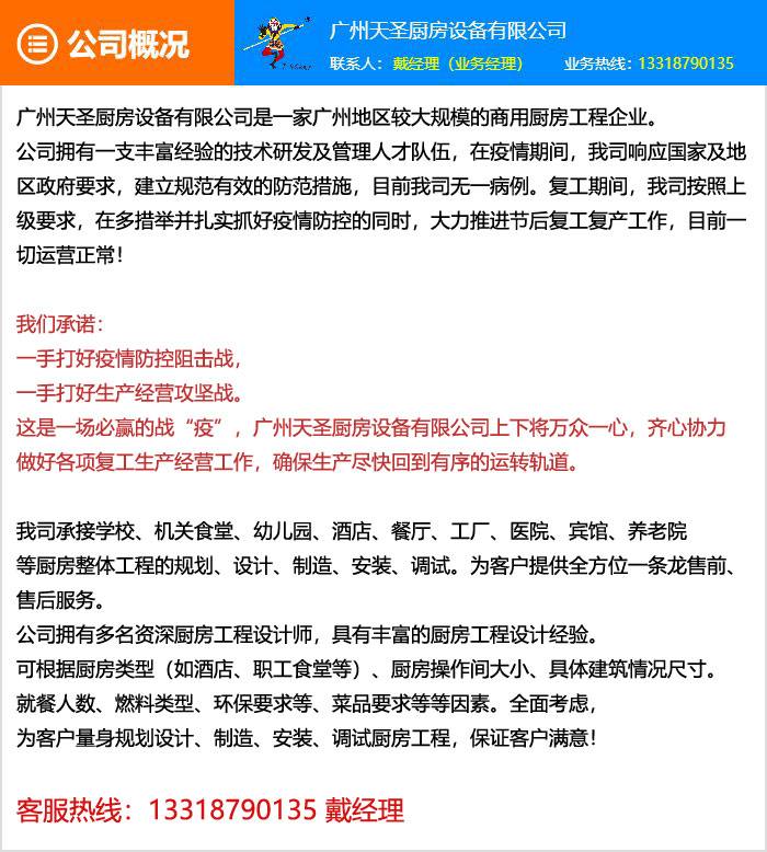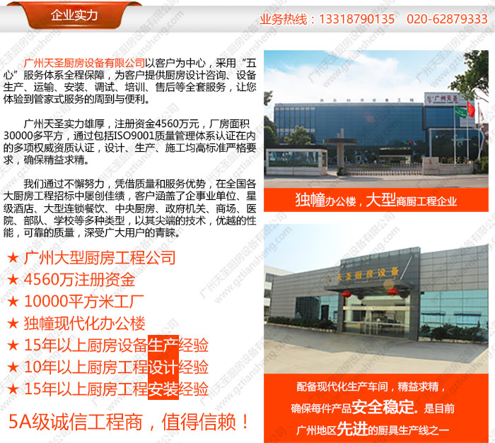 公司专营:各种厨房设备,中西餐厨具、餐具、炉具,冷藏雪柜,酒店设备,面包房设备,自助餐设备,食品加工机械及厨房配套服务。为各类厨房设备工程提供优质的产品,并符合国家环保要求,是目前广州地区节能环保厨具大型的厨具企业之一。