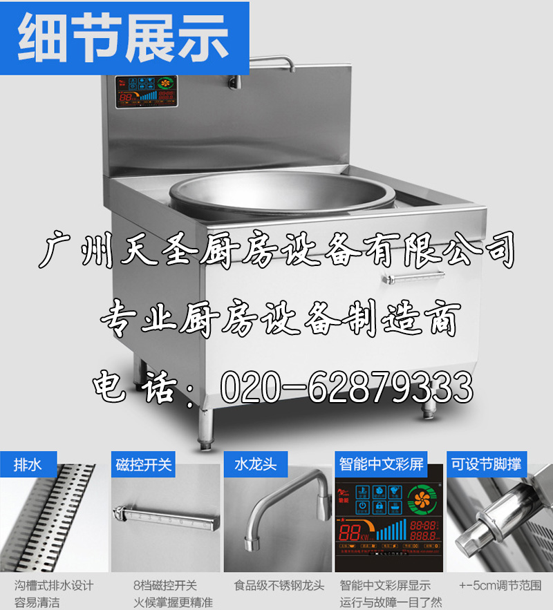功能完善:电磁大炒炉可替代传统厨具的煎、炸、等各类烹调功能。